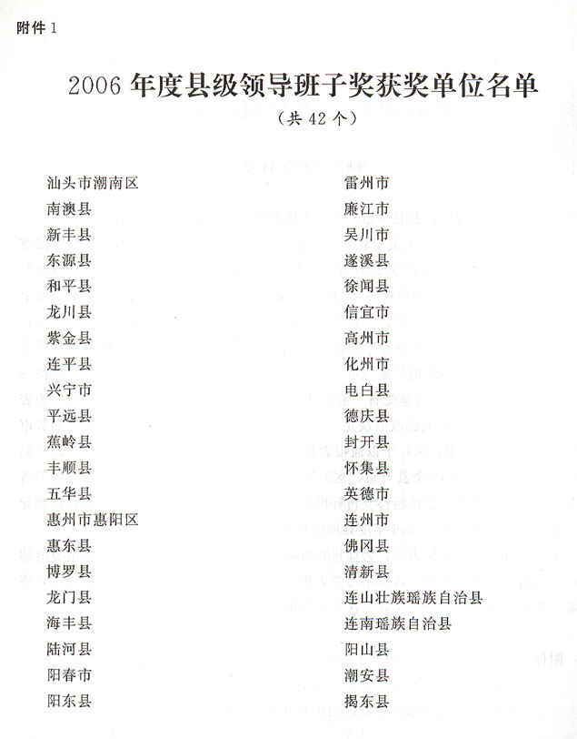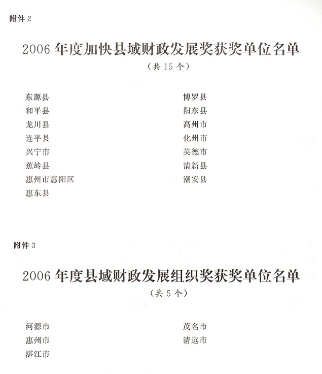 各地級(jí)以上市人民政府,各縣(市、區(qū))人民政府,省政府各部門、各直屬機(jī)構(gòu): 為貫徹落實(shí)黨的十六大關(guān)于壯大縣域經(jīng)濟(jì)、全面建設(shè)小康社會(huì)的精神,按照省委、省政府統(tǒng)一部署,我省從2004年起實(shí)施激勵(lì)型財(cái)政機(jī)制,充分調(diào)動(dòng)了縣(市)發(fā)展經(jīng)濟(jì)、增加財(cái)政收入的積極性,取得顯著成效。2006年,全省地級(jí)以上市、縣上劃省“四稅”平均增長(zhǎng)21.27%。其中,粵東、粵西和粵北地區(qū)平均增長(zhǎng)21.53%,42個(gè)縣(市、區(qū))獲得上劃省“四稅”超過(guò)全省平均水平返還獎(jiǎng)勵(lì)及領(lǐng)導(dǎo)班子獎(jiǎng)勵(lì),占粵東、粵西和粵北地區(qū)縣(市、區(qū))數(shù)的63.64%;53個(gè)縣(市、區(qū))獲得一般性轉(zhuǎn)移支付補(bǔ)助獎(jiǎng)勵(lì),占享受省一般性轉(zhuǎn)移支付補(bǔ)助縣(市、區(qū))數(shù)的79.10%.為表彰先進(jìn),樹(shù)立榜樣,省人民政府決定,對(duì)獲得2006年度縣級(jí)領(lǐng)導(dǎo)班子獎(jiǎng)勵(lì)的汕頭市潮南區(qū)等42個(gè)縣(市、區(qū))予以通報(bào)表彰,授予獲得100萬(wàn)元以上縣級(jí)領(lǐng)導(dǎo)班子獎(jiǎng)勵(lì)的河源市東源縣等15個(gè)縣(市、區(qū))“2006年度加快縣域財(cái)政發(fā)展獎(jiǎng)”;授予所屬縣(市)全部獲得一般性轉(zhuǎn)移支付補(bǔ)助獎(jiǎng)勵(lì)、上劃省“四稅”返還獎(jiǎng)勵(lì)和縣級(jí)領(lǐng)導(dǎo)班子獎(jiǎng)勵(lì)的河源等5市“2006年度縣域財(cái)政發(fā)展組織獎(jiǎng)”。 受表彰的單位要再接再厲,為促進(jìn)我省縣域經(jīng)濟(jì)發(fā)展作出新的貢獻(xiàn)。各地要繼續(xù)全面貫徹落實(shí)科學(xué)發(fā)展觀,認(rèn)真學(xué)習(xí)受表彰單位的經(jīng)驗(yàn)和做法,進(jìn)一步加快縣域經(jīng)濟(jì)發(fā)展,為實(shí)現(xiàn)我省經(jīng)濟(jì)社會(huì)又好又快發(fā)展作出更大貢獻(xiàn)。 附件:1.2006年度縣級(jí)領(lǐng)導(dǎo)班子獎(jiǎng)獲獎(jiǎng)單位名單 2.2006年度加快縣域財(cái)政發(fā)展獎(jiǎng)獲獎(jiǎng)單位名單 3.2006年度縣域財(cái)政發(fā)展組織獎(jiǎng)獲獎(jiǎng)單位名單 廣東省人民政府 二○○七年五月九日