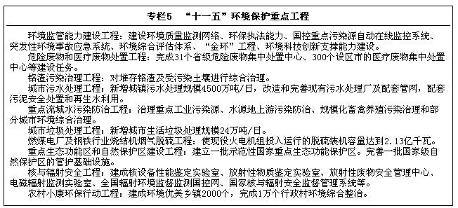 四、重點工程和投資重點 解決我國環境問題,必須以規劃為依據,以項目為依托,以投資作保障,通過落實規劃、落實資金、落實項目,把實現“十一五”環保目標落到實處。 (一)重點工程。 加快完成國家“十五”各項重點治理計劃的結轉項目,及時開工列入國家“十一五”規劃的項目,研究論證一批新的工程項目。“十一五”期間,重點實施10項環境保護工程。要調動各種資源,開辟多元化投資渠道,集中力量和資金,重點建設。