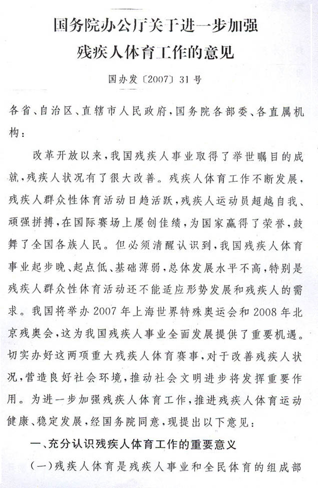 現將《國務院辦公廳關于進一步加強殘疾人體育工作的意見》(國辦發〔2007〕31號)轉發給你們,請認真貫徹執行。