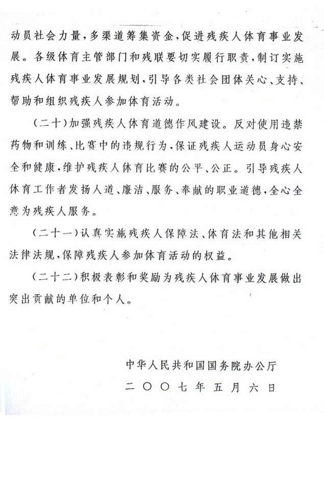 近年來,我省殘疾人體育工作發展迅速,殘疾人群眾性體育活動日趨活躍,殘疾人競技體育水平不斷提高,殘疾人運動員在國際、國內賽場屢創佳績,為國家、為我省贏得了榮譽。但總體而言,我省殘疾人體育事業起步晚、起點低、基礎薄弱,整體發展水平仍不高,特別是殘疾人競技體育水平與部分兄弟省相比還有較大的差距,與我省經濟社會發展水平和建設體育強省的要求不相適應。為此,省人民政府要求,各地、各有關部門要進一步提高認識,以備戰2007年世界特殊奧運會、2008年殘奧會、2010年亞洲殘運會為契機,把殘疾人體育納入體育事業發展規劃,加大經費投入,加強殘疾人體育訓練基地建設和人才隊伍建設,加快殘疾人體育項目發展,廣泛深入開展殘疾人康復健身和體育健身活動,推動我省殘疾人體育工作邁上新臺階,促進我省殘疾人體育工作與經濟社會及殘疾人事業協調發展。