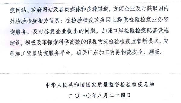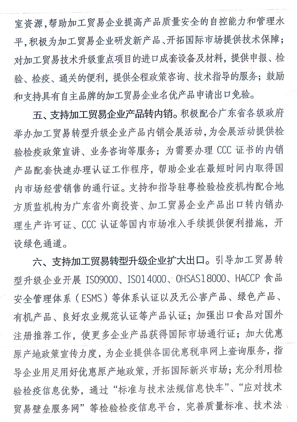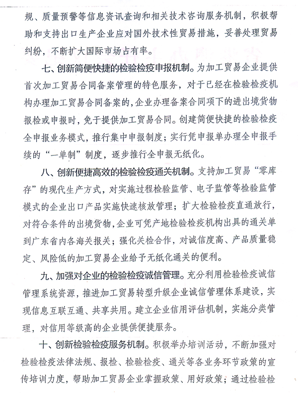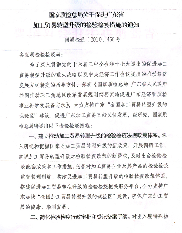 各地級以上市人民政府,省政府各部門、各直屬機構: 近日,國家質檢總局根據廣東出入境檢驗檢疫局調研意見,出臺了《國家質檢總局關于促進廣東省加工貿易轉型升級的檢驗檢疫措施的通知》(國質檢通〔2010〕456號),支持我省建設全國加工貿易轉型升級試驗區。根據省政府領導意見,現將國質檢通〔2010〕456號文轉發給你們,請認真組織學習宣傳,配合做好相關工作。同時,各地、各部門要借鑒國家質檢總局和廣東出入境檢驗檢疫局的做法,積極采取有效措施,為加工貿易企業轉型升級提供優質、高效的服務。