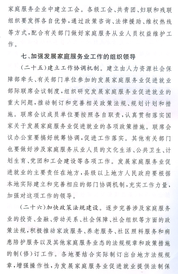 為加強對全省發(fā)展家庭服務(wù)業(yè)工作的組織領(lǐng)導(dǎo),完善工作協(xié)調(diào)機制,省人民政府同意建立由省人力資源社會保障廳牽頭,有關(guān)部門和單位參加的省發(fā)展家庭服務(wù)業(yè)促進就業(yè)部門間聯(lián)席會議制度,負(fù)責(zé)對全省發(fā)展家庭服務(wù)業(yè)工作進行統(tǒng)籌協(xié)調(diào)和督促指導(dǎo)。各地也要抓緊建立相應(yīng)的協(xié)調(diào)機制,并將有關(guān)情況及時向省聯(lián)席會議報告。
