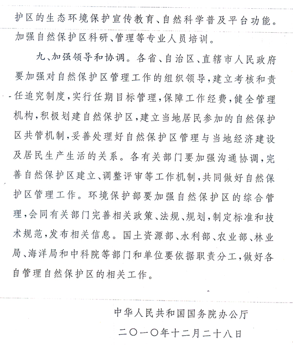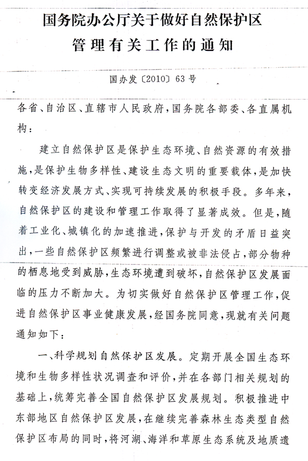 轉(zhuǎn)發(fā)國(guó)務(wù)院辦公廳關(guān)于做好自然保護(hù)區(qū) 管理有關(guān)工作的通知 ? 各地級(jí)以上市人民政府,各縣(市、區(qū))人民政府,省政府各部門、各直屬機(jī)構(gòu): 現(xiàn)將《國(guó)務(wù)院辦公廳關(guān)于做好自然保護(hù)區(qū)管理有關(guān)工作的通知》(國(guó)辦發(fā)〔2010〕63號(hào))轉(zhuǎn)發(fā)給你們,請(qǐng)認(rèn)真貫徹執(zhí)行。 近年來,在各地、各有關(guān)部門的共同努力下,我省自然保護(hù)區(qū)建設(shè)工作取得顯著成績(jī),全省共建成自然保護(hù)區(qū)360個(gè),其中,國(guó)家級(jí)11個(gè)、省級(jí)66個(gè),自然保護(hù)區(qū)數(shù)量居全國(guó)首位,為建設(shè)“綠色廣東”和環(huán)境友好型社會(huì)發(fā)揮了重要作用。但一些地區(qū)自然保護(hù)區(qū)也存在重申報(bào)輕保護(hù)、重建設(shè)輕管理和地方級(jí)自然保護(hù)區(qū)調(diào)整程序不規(guī)范等問題。省人民政府要求,各地、各有關(guān)部門要按照國(guó)辦發(fā)〔2010〕63號(hào)文的部署和要求,進(jìn)一步加強(qiáng)自然保護(hù)區(qū)建設(shè)管理工作,提升自然保護(hù)區(qū)管理和保護(hù)水平,為加快轉(zhuǎn)型升級(jí)、建設(shè)幸福廣東提供生態(tài)環(huán)境保障。 我省地方級(jí)自然保護(hù)區(qū)調(diào)整管理規(guī)定另行印發(fā)。 ? ? ? 廣東省人民政府辦公廳 二○一一年二月十四日 ? ? ?