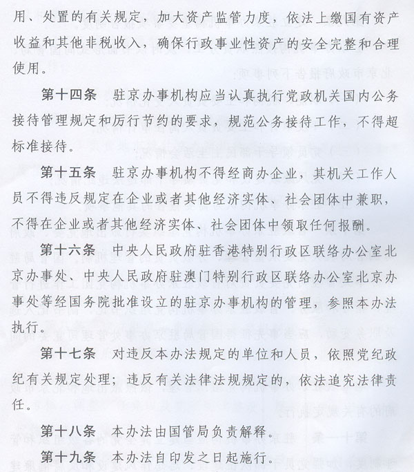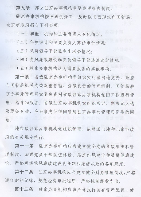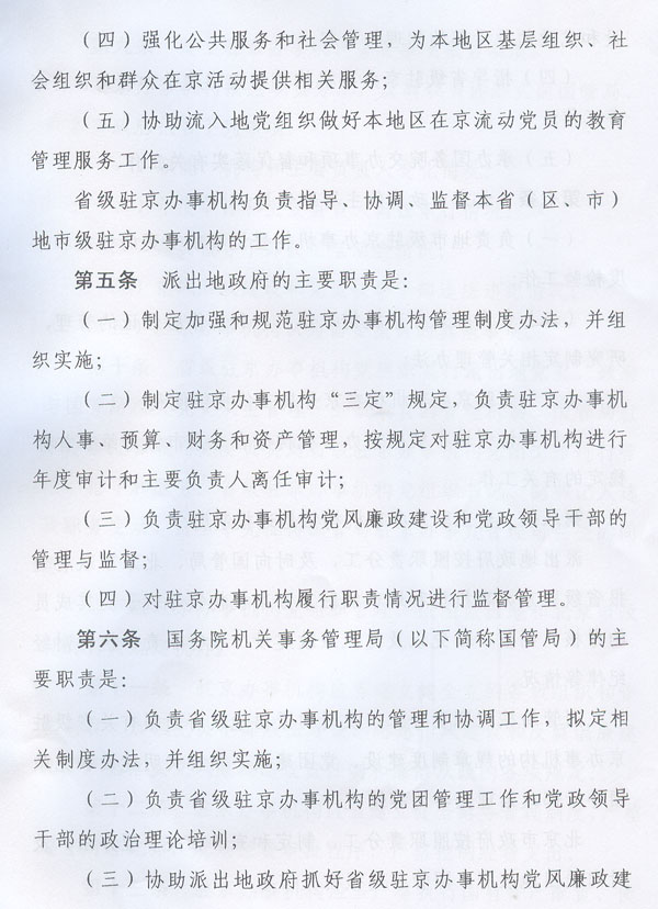 ? 轉發國務院機關事務管理局北京市人民政府 關于印發各省區市人民政府駐北京 辦事機構管理辦法的通知 ? 各地級以上市人民政府,順德區人民政府,省直有關單位: 經省人民政府同意,現將國務院機關事務管理局、北京市人民政府《關于印發〈各省區市人民政府駐北京辦事機構管理辦法〉的通知》(國管辦〔2011〕318號,以下簡稱《管理辦法》)轉發給你們,結合我省實際提出如下意見,請一并貫徹執行。 一、我省各駐京辦事機構要認真貫徹落實《管理辦法》的各項工作要求,切實做到規范職能、廉潔從政、務實為民,不斷強化公共服務和社會管理職能。要建立重要事項報告制度,健全黨的各級組織和管理制度,完善財務和資產管理制度,嚴格執行黨政機關公務接待管理規定。要加強與國務院機關事務管理局、北京市人民政府的溝通協調,努力在推動地區間協作、服務本地區經濟社會發展、處置突發事件、維護首都穩定等方面發揮更加積極有效的作用。 二、設有駐京辦事機構的地級以上市人民政府和順德區人民政府,要切實履行監督管理職責,按照《管理辦法》的要求,研究制訂并組織實施加強和規范本地區駐京辦事機構管理的制度辦法,制訂和落實駐京辦事機構“三定”方案,嚴格執行黨風廉政建設責任制,加強駐京辦事機構人事、預算、財務和資產管理,按規定開展相關審計工作。要及時向國務院機關事務管理局、北京市人民政府和省政府駐京辦通報駐京辦事機構人事工作、履行職責、黨風廉政建設等方面的情況。省政府辦公廳將另行制訂加強和規范駐京辦事機構管理的制度辦法。 三、省駐京辦要切實加強對我省各駐京辦事機構的指導、協調、監督,統籌全省在京資源,形成工作合力;要按照《關于同意成立中共廣東省駐北京機構委員會的批復》(粵組黨〔2010〕14號)的要求,抓緊推進中共廣東省駐北京機構委員會組建工作。各駐京辦事機構要加強與省駐京辦的溝通聯系,及時將處置突發事件、信訪維穩及廉政建設等方面的情況報送省駐京辦,并積極配合省駐京辦做好相關工作。 ? ? ? ? 廣東省人民政府辦公廳 二○一一年八月二十四日 ? ? ? ?