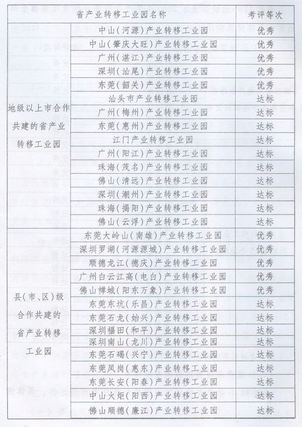 注:考評同等次的地級以上市排名不分先后。 (二)省產業轉移工業園考評結果。 全省34個省產業轉移工業園目標責任考核均達標,具體情況如下: