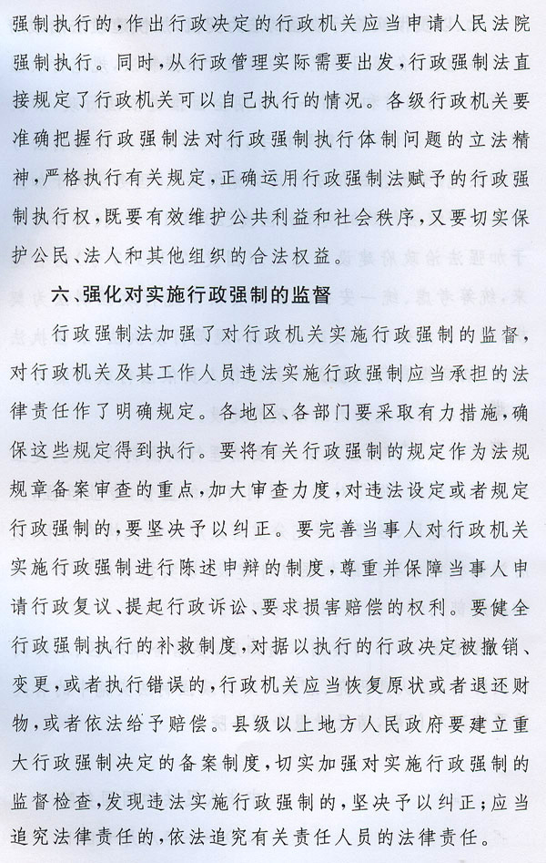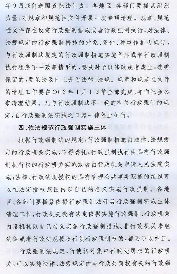 各地級以上市人民政府,各縣(市、區)人民政府,省政府各部門、各直屬機構: 現將《國務院關于貫徹實施〈中華人民共和國行政強制法〉的通知》(國發〔2011〕25號)轉發給你們,并結合我省實際,提出以下意見,請一并貫徹實施。 一、認真開展有關行政強制規定的清理工作 各地、各部門要抓緊組織力量,對現行有關行政強制的地方性法規、政府規章和規范性文件開展一次專項清理,對行政強制依據、實施主體、實施程序等現行規定與行政強制法不一致的,要及時修改或者廢止。各地級以上市人民政府、順德區人民政府負責本級政府規章、規范性文件的清理工作,并負責匯總所轄各縣(市、區)政府的清理結果。各部門、各直屬機構負責本單位牽頭實施或者配合實施的地方性法規、政府規章和規范性文件的清理工作。有關全省行政強制規定的清理工作由省法制辦牽頭負責。 二、加快推進行政強制法配套制度建設 各地、各部門要根據行政強制法的規定,結合實際,建立健全實施行政強制法的相關配套制度,規范行政強制程序。省法制辦和各較大的市法制機構要著重就與實施行政強制法相配套、涉及行政機關共同行為的制度建設進行調研,待條件成熟時,提請制訂相應的地方性法規或規章。 三、切實加強對實施行政強制行為的監督 各地、各部門要結合行政執法責任制建設,加強對實施行政強制行為的監督,確保行政強制行為合法、適當。法制部門要加強對行政機關實施行政強制行為的監督,并配合監察部門嚴肅查處違法實施行政強制的責任人。逐步將行政機關實施行政強制工作納入行政執法電子監察系統。 ? 廣東省人民政府 二○一一年十月十七日?