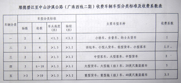 省交通運(yùn)輸廳、物價(jià)局: 粵交費(fèi)〔2010〕358號請示收悉。省人民政府同意順德碧江至中山沙溪公路(廣珠西線二期)交工驗(yàn)收通車和收費(fèi)站收費(fèi)設(shè)施經(jīng)驗(yàn)收符合省聯(lián)網(wǎng)收費(fèi)技術(shù)要求后開始收費(fèi),收費(fèi)車型按全省高速公路統(tǒng)一標(biāo)準(zhǔn),即按車輛軸(輪)數(shù)及車頭高度等物理參數(shù)進(jìn)行分類,一至五類車收費(fèi)系數(shù)分別是1、1.5、2、3、3.5;收費(fèi)標(biāo)準(zhǔn)為0.6元/標(biāo)準(zhǔn)車公里。 ? 附件:1.順德碧江至中山沙溪公路(廣珠西線二期)收費(fèi)車輛車型分類標(biāo)準(zhǔn)及收費(fèi)系數(shù)表 2.順德碧江至中山沙溪公路(廣珠西線二期)車輛通行費(fèi)收費(fèi)標(biāo)準(zhǔn)表