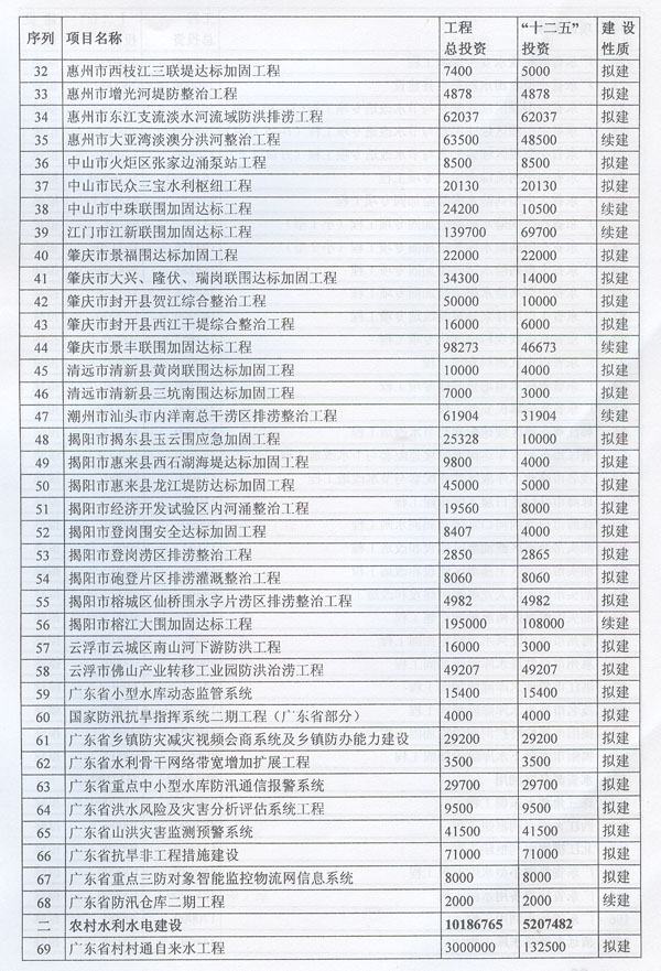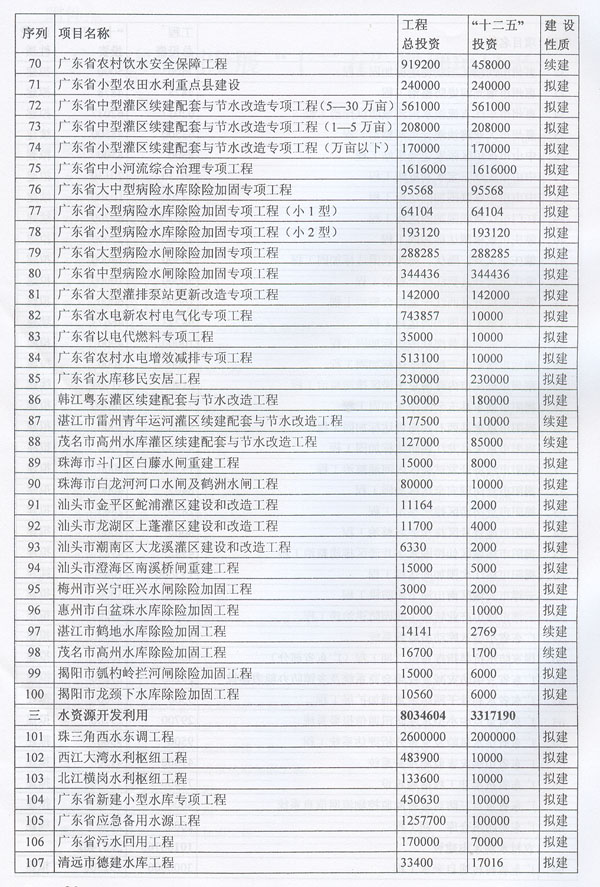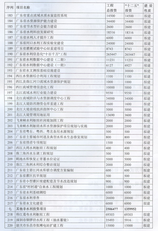 ? 印發廣東省水利發展“十二五”規劃的通知 ? 各地級以上市人民政府,各縣(市、區)人民政府,省政府各部門、各直屬機構: 《廣東省水利發展“十二五”規劃》已經省人民政府同意,現印發給你們,請認真貫徹實施。實施中遇到的問題,請徑向省水利廳、發展改革委反映。 ? ? ? ? 廣東省人民政府辦公廳二○一一年十二月二十九日 ? ? ? 廣東省水利發展“十二五”規劃 ? ? ? ? 目 錄 ? 一、現狀與形勢 …………………………………………………………(1) (一)“十一五”時期廣東水利發展成效顯著…………………………(1) (二)“十二五”時期廣東水利發展形勢………………………………(2) 1.廣東水利跨越式發展面臨的挑戰 ……………………………………(2) 2.廣東水利發展進入重要戰略機遇期 …………………………………(3) 二、指導思想、基本原則和規劃目標……………………………………(3) (一)指導思想……………………………………………………………(3) (二)基本原則……………………………………………………………(4) (三)規劃目標……………………………………………………………(5) 三、主要任務………………………………………………………………(6) (一)完善農村水利基礎設施……………………………………………(6) 1.突出加強農田水利建設 ………………………………………………(6) 2.繼續推進農村飲水安全工程 …………………………………………(6) 3.開展農村重點易澇區整治 ……………………………………………(7) 4.加強農村水電與電氣化建 ……………………………………………(7) 5.推進水庫移民安居工程建設 …………………………………………(7) (二)加強防洪體系建設…………………………………………………(7) 1.完善主要江河防洪體系 ………………………………………………(7) 2.加強中小河流治理 ……………………………………………………(8) 3.加快推進“千里海堤加固達標工程” ………………………………(8) 4.繼續實施病險水庫水閘除險加固工程 ………………………………(8) 5.強化山洪災害防治 ……………………………………………………(9) 6.強化非工程措施建 ……………………………………………………(9) (三)優化水資源配………………………………………………………(9) 1.加快建設水利樞紐及河庫水系連通工程 ……………………………(9) 2.加快建設調引提蓄水工程 ……………………………………………(10) 3.加快推進應急備用水源及非常規水源建設 …………………………(10) (四)加強水資源保護與節約……………………………………………(10) 1.加強重點飲用水水源地保護 …………………………………………(10) 2.加強水庫水資源保護 …………………………………………………(11) 3.加大地下水保護力度 …………………………………………………(11) 4.加強重點河道(涌)整治 ……………………………………………(11) 5.加強水土保持與生態修復 ……………………………………………(11) 6.全面推進節水型社會建設 ……………………………………………(11) (五)實行最嚴格水資源管理制度………………………………………(12) 1.建立用水總量控制制度 ………………………………………………(12) 2.建立用水效率控制制度 ………………………………………………(12) 3.建立水功能區限制納污制度 …………………………………………(13) (六)深化水利體制機制改革……………………………………………(13) 1.深化水管體制改革 ……………………………………………………(13) 2.加強水利法制建設 ……………………………………………………(13) 3.大力提升水利行業能力 ………………………………………………(13) 4.提高水利應急管理能力 ………………………………………………(14) 5.強化水行政執法能力 …………………………………………………(14) 6.推動水文化建設 ………………………………………………………(15) 四、保障措施………………………………………………………………(15) (一)加強組織領導………………………………………………………(15) (二)加大資金投入………………………………………………………(15) (三)科學制訂規劃………………………………………………………(15) (四)加強隊伍建設………………………………………………………(16) (五)強化監督檢查………………………………………………………(16) (六)重視環境保護………………………………………………………(16) 附件:廣東省水利發展“十二五”規劃項目表…………………………(18) ? ? ? 加快水利改革發展事關農業農村發展,事關防洪安全、供水安全、糧食安全和生態安全,事關經濟社會發展全局。根據中央水利工作會議、《中共中央國務院關于加快水利改革發展的決定》(中發〔2011〕1號)和省水利工作會議、《中共廣東省委廣東省人民政府關于加快我省水利改革發展的決定》(粵發〔2011〕9號)以及《廣東省國民經濟和社會發展第十二個五年規劃綱要》精神,制定本規劃。 一、現狀與形勢 (一)“十一五”時期廣東水利發展成效顯著。 省委、省政府高度重視水利工作,帶領全省人民積