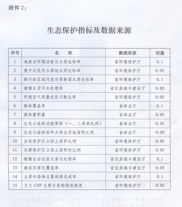 選擇15項(xiàng)客觀反映地區(qū)生態(tài)保護(hù)和改善情況的生態(tài)保護(hù)指標(biāo)(見附件2),由省直相關(guān)主管部門負(fù)責(zé)核準(zhǔn)并提供當(dāng)年和上年度有關(guān)指標(biāo)的原始數(shù)值,省財(cái)政廳按照核算辦法及其相應(yīng)的指標(biāo)權(quán)重計(jì)算確定生態(tài)保護(hù)指標(biāo)綜合增長(zhǎng)率。生態(tài)保護(hù)指標(biāo)綜合增長(zhǎng)率大于0的,增長(zhǎng)率越高,獲得激勵(lì)性補(bǔ)償越多;反之,則越小。生態(tài)保護(hù)指標(biāo)綜合增長(zhǎng)率等于或小于0的,如不低于2009年基期年水平,不享受激勵(lì)性補(bǔ)償,但也不扣減基礎(chǔ)性補(bǔ)償;如低于2009年基期年水平,每低于1個(gè)百分點(diǎn)相應(yīng)扣減當(dāng)年基礎(chǔ)性補(bǔ)償資金1%。