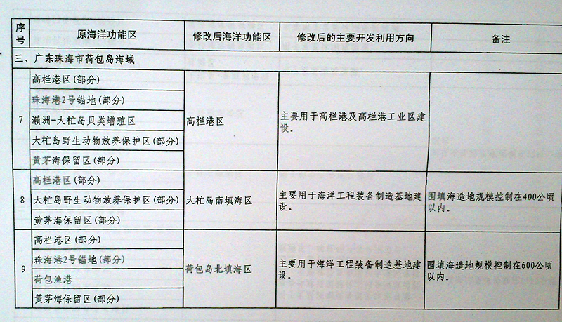 各地級以上市人民政府,各縣(市、區)人民政府,省政府各部門、各直屬機構: 根據國家海洋局《關于同意廣東省海洋功能區劃修改方案的函》(國海管字〔2012〕190號),經國務院同意,對《廣東省海洋功能區劃》(文本見粵府〔2008〕57號文)作出如下修改:將珠海市橫琴新區、三灶、荷包島3個海域的原16個功能區調整為9個功能區(修改方案見附件),其中“橫琴南填海區”圍填海造地規??刂圃?790公頃以內,“三灶東填海區”和“三灶南填海區”兩個功能區圍填海造地規模控制在1291公頃以內,“大杧島南填海區”圍填海造地規??刂圃?00公頃以內,“荷包島北填海區”圍填海造地規模控制在600公頃以內?!稄V東省海洋功能區劃》其他內容保持不變。各有關地區、有關部門要嚴格執行海洋功能區劃制度,按照修改后的功能區劃,落實海域使用管理和海洋環境保護要求。