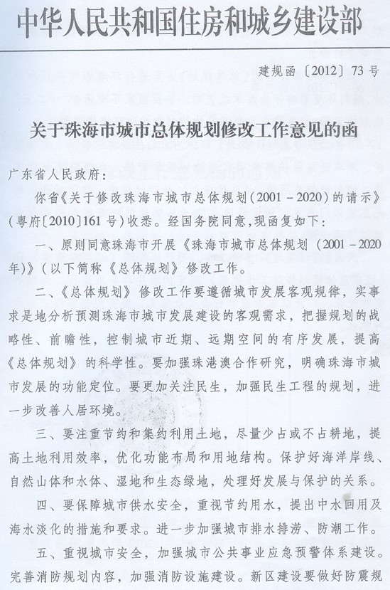 珠海市人民政府,省住房城鄉建設廳: 現將住房和城鄉建設部《關于珠海市城市總體規劃修改工作意見的函》(建規函〔2012〕73號)轉發給你們,請遵照實施。