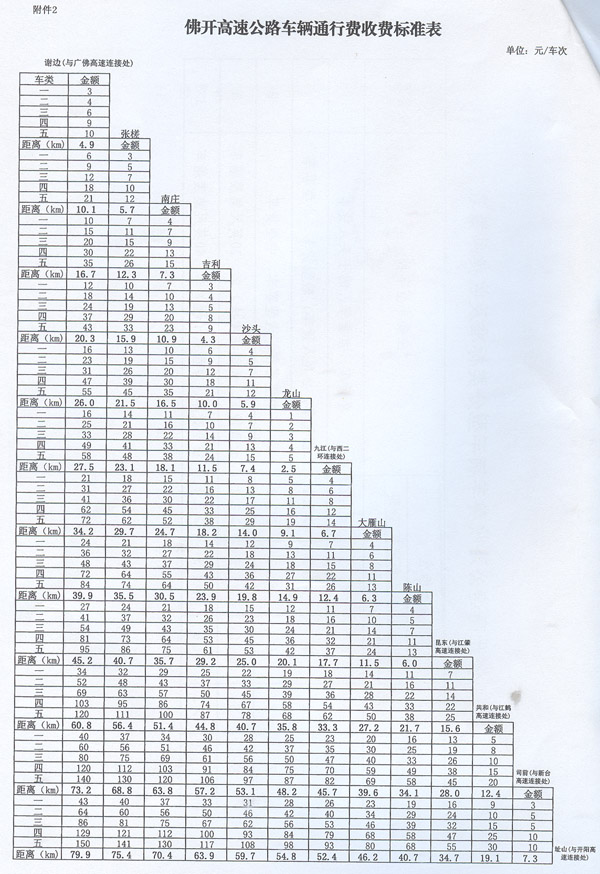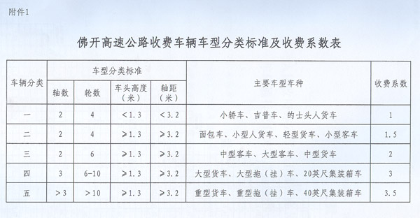 | ? 廣東省人民政府辦公廳關于佛開高速公路 車輛通行費有關問題的復函 ? 省交通運輸廳、物價局: 粵交費〔2012〕1220號請示收悉。省人民政府同意佛開高速公路謝邊至三堡段改擴建工程交工驗收通車和收費站收費設施經驗收符合省聯網收費技術要求后,佛開高速公路按全省高速公路統一標準進行收費。收費車型按車輛軸(輪)數及車頭高度等物理參數進行分類,一至五類車的收費系數分別為1、1.5、2、3、3.5;三堡至開平段收費標準為0.45元/標準車公里,謝邊至三堡段收費標準為0.6元/標準車公里。 ? 附件:1.佛開高速公路收費車輛車型分類標準及收費系數表 2.佛開高速公路車輛通行費收費標準表 ? ? ? 省府辦公廳 2012年12月18日 ? ? ?