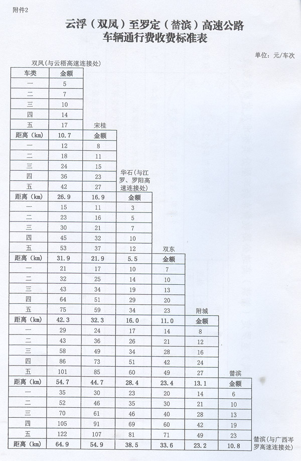 | ? 廣東省人民政府辦公廳關于云浮(雙鳳)至羅定(榃濱) 高速公路車輛通行費有關問題的復函 ? 省交通運輸廳、物價局: 粵交費〔2012〕1345號請示收悉。省人民政府同意云浮(雙鳳)至羅定(榃濱)高速公路交工驗收通車和收費站收費設施經驗收符合省聯網收費技術要求后開始收費,收費車型按全省高速公路統一標準,即按車輛軸(輪)數及車頭高度等物理參數進行分類,一至五類車的收費系數分別為1、1.5、2、3、3.5;雙鳳至華石段收費標準為0.45元/標準車公里,華石至省界段收費標準為0.6元/標準車公里。 ? ? 附件:1.云浮(雙鳳)至羅定(榃濱)高速公路收費車輛車型分類標準及收費系數表 ? 2.云浮(雙鳳)至羅定(榃濱)高速公路車輛通行費收費標準表 ? ? ? 省府辦公廳 2012年12月17日 ? ? ? ?