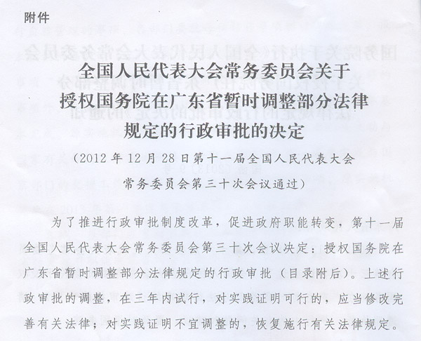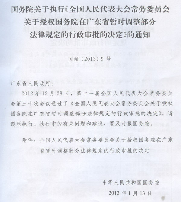 現將《國務院關于執行〈全國人民代表大會常務委員會關于授權國務院在廣東省暫時調整部分法律規定的行政審批的決定〉的通知》(國函〔2013〕9號)轉發給你們,請認真貫徹執行。