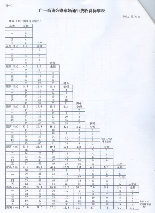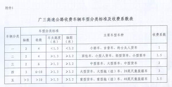 粵交費〔2013〕155、224號請示收悉。省人民政府同意廣三高速公路改擴建工程設(shè)立云東海匝道收費站。該擴建工程交工驗收通車和收費站收費設(shè)施經(jīng)驗收符合省聯(lián)網(wǎng)收費技術(shù)要求后,廣三高速公路按全省高速公路統(tǒng)一標(biāo)準(zhǔn)進行收費,即收費車型按車輛軸(輪)數(shù)及車頭高度等物理參數(shù)進行分類,一至五類車的收費系數(shù)分別為1、1.5、2、3、3.5;收費標(biāo)準(zhǔn)為0.6元/標(biāo)準(zhǔn)車公里。  2.廣三高速公路車輛通行費收費標(biāo)準(zhǔn)表 ? ? 省府辦公廳 2013年3月14日 ?