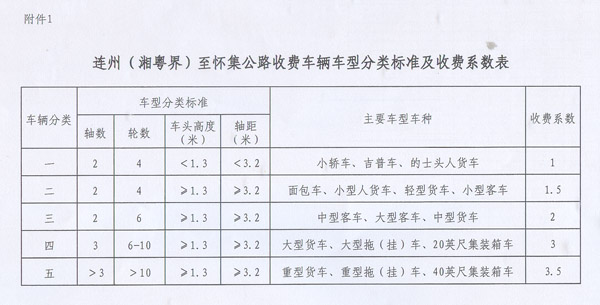 粵交費〔2013〕1300號請示收悉。省人民政府同意連州(湘粵界)至懷集公路(即二廣高速公路懷集至連州段)交工驗收通車和收費站收費設施經驗收符合省聯網收費技術要求后開始收費,收費車型按全省高速公路統一標準,即按車輛軸(輪)數及車頭高度等物理參數進行分類,一至五類車的收費系數分別為1、1.5、2、3、3.5;粵湘省界至鶴塘段及連州連接線收費標準為0.45元/標準車公里,鶴塘至懷集南段及懷集支線收費標準為0.6元/標準車公里。
