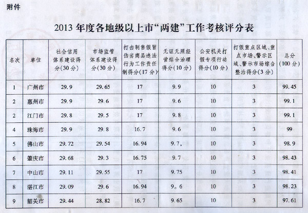 2013年以來,全省各地認真貫徹落實省委、省政府關于社會信用體系建設和市場監管體系建設(以下簡稱“兩建”)工作的各項部署,加強組織領導,明確分工責任,分解工作任務,有計劃、有目標、有步驟地組織開展“兩建”工作,為我省經濟平穩健康發展、社會和諧穩定作出了積極貢獻。根據《中共廣東省委辦公廳廣東省人民政府辦公廳關于撤并和規范省級考核檢查評比表彰活動的意見》(粵辦發〔2013〕11號),2014年1月,省“兩建”工作領導小組辦公室對各地級以上市“兩建”工作進行了考核。經綜合評定,21個地級以上市“兩建”工作考核全部合格,其中,廣州、惠州、江門、珠海市成績比較顯著。經省人民政府同意,現將各地“兩建”工作情況通報如下: 一、精心部署落實 省“兩建”工作會議召開后,各地級以上市政府高度重視,及時召開相關工作會議,認真貫徹落實省委、省政府關于“兩建”工作的政策部署,并以多種形式出臺有關文件,狠抓各項工作任務落實。在市場監管體系建設方面,廣州、深圳等市結合實際制定了本市的市場監管體系建設規劃,惠州、陽江等市制定了貫徹落實省市場監管體系建設規劃的實施意見;在社會信用體系建設方面,廣州、珠海、中山等市制訂了《社會信用體系建設規劃(2013—2020年)》,廣州市還出臺了《廣州市信息共享管理規定》、《廣州市社會信用促進條例》等多項規章制度。 一是市場準入體系建設取得較大突破。率先在全國開展商事登記制度改革試點,按照“寬進嚴管”的原則,推進工商登記制度改革,清理、壓減前置審批事項,放寬登記準入條件,實行先證后照,強化事中、事后監管。2013年3月1日,深圳、珠海正式實施具有地方性法規效力的商事登記制度。據統計,深圳、珠海、東莞、順德等商事登記制度改革試點地區,新登記市場主體增幅分別達到96.3%、41.5%、17.0%和16.4%,同期非試點地區市場主體增幅僅為0.5%。二是行政執法體系建設取得良好效果。進一步深化行政審批制度改革,大力簡政放權,共調整市級行政審批事項6165項、縣級14934項。積極探索建立綜合行政執法體制,推動執法重心下移。佛山市順德區按土地、醫藥、市場、城市管理四大領域,整合行政執法職責和隊伍,規范行政執法行為,規范行政處罰自由裁量權;珠海市制定《珠海市行政機關執法依據匯編》、《珠海市規范行政處罰自由裁量權工作方案》。三是消費維權和社會監督體系建設取得重大進展。以“12345”熱線為載體整合各部門投訴舉報資源,建設便民、高效的消費維權申訴、經濟違法行為舉報和行政效能投訴平臺,實現統一接聽、按責轉辦、限時辦結、統一督辦、統一考核。除東莞、揭陽市外,目前全省已有19個地級以上市實現“12345”統一投訴舉報平臺上線運行。四是政務誠信建設深入推進。積極推進招標投標和政府采購領域政務誠信建設,全部實現各市縣網上辦事分廳與省網上辦事大廳對接,實現省、市、縣(區)三級數據同步,進一步提高行政審批效率。珠海市圍繞電子政務、科學民主決策等方面開展政務誠信建設,在網上辦事大廳珠海分廳增加公共資源網上交易、市民個人網頁等內容。五是加快推進質量監管體系建設。強化“不合格產品發現率”理念,著力完善產(商)品監督抽查制度,大力實施標準化戰略,提升電子商務質量,逐步建立現代質量監管體系。廣州、惠州等市大力完善公共與民生服務領域標準體系,深圳、佛山等市改革流通領域商品監管方式,中山、茂名等市加強產品質量監督抽查,梅州、肇慶等市大力推動旅游電子合同。六是進一步理順食品安全監管體制機制。以食品安全監管體制改革為契機,進一步理順食品安全監管職責,出臺市縣兩級食品安全監管體制改革文件,做好機構編制、職能調整和人員劃分等工作。 一是信用激勵和懲戒機制建設取得明顯成效。惠州、珠海市分別出臺了《關于建立企業信用聯動獎懲機制的意見》、《珠海市守信激勵和失信懲戒辦法》,積極探索建立守信激勵和失信懲戒機制。二是信用信息開發應用與服務市場培育進程加快。整合現有信用信息資源,推進信用信息的深度開發和應用,如深圳市以信用數據聯動應用為抓手,在財政專項資金管理、進出口監管、公共資源交易等重點領域開展信用分類監管。推動信用評級業發展,信用產品已廣泛應用到政府公共管理、企業商貿活動以及個人求職等眾多領域。其中,云浮市在本地設立首家信用服務公司,開展評級業務;湛江市成立了誠信協會,發展會員單位259家。三是金融市場監管得以強化。積極推進金融穩定機制建設,優化地方金融市場環境。廣州市成立了全省首家金融審判庭,探索出加強金融市場監管的新模式;江門市成立了全國首個金融消費權益保護聯合會,創造良好金融消費環境。 深入開展無證無照經營綜合治理、公安機關打假專項行動、打擊制售假冒偽劣商品違法行為工作責任制等專項工作,工商、公安、質監等部門切實履行牽頭責任,全力配合“兩建”考核工作。進一步健全無證無照經營綜合治理工作機構,各地級以上市建立了聯席會議制度,并逐步推廣到區(縣)、鄉鎮。廣州市引入電子效能監察,對無證無照經營重點區域明察暗訪,對存在問題進行通報批評和督促整改,有力地推動了職能部門履職盡責。加大打擊制售假冒偽劣商品違法行為力