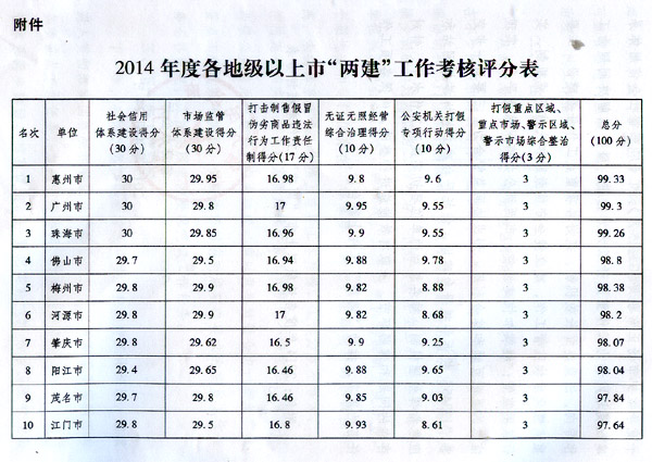 按照省委、省政府關于加強社會信用體系建設和市場監管體系建設(以下簡稱“兩建”)工作部署和《2014年度廣東省社會信用體系建設和市場監管體系建設工作考核方案》要求,省“兩建”工作領導小組辦公室牽頭組織省有關單位對各地級以上市政府“兩建”工作進行了考核。經綜合評定,21個地級以上市考核全部合格,其中,惠州、廣州、珠海市成績顯著。經省人民政府同意,現將全省“兩建”工作情況通報如下: