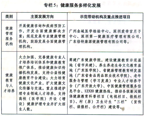21.切實(shí)推動(dòng)健康服務(wù)產(chǎn)業(yè)集聚發(fā)展。科學(xué)規(guī)劃、因勢(shì)利導(dǎo),打造健康服務(wù)產(chǎn)業(yè)集群,鼓勵(lì)各地政府和龍頭企業(yè)整合健康服務(wù)產(chǎn)業(yè)資源,打造研發(fā)制造、流通應(yīng)用、管理服務(wù)一體化全產(chǎn)業(yè)鏈的大型健康產(chǎn)業(yè)集團(tuán),支持有條件的地區(qū)設(shè)立健康服務(wù)產(chǎn)業(yè)示范園區(qū)。珠三角地區(qū)突出高端引領(lǐng),以智能化、網(wǎng)絡(luò)化、移動(dòng)化為方向,有效提升以現(xiàn)代醫(yī)療器械、康復(fù)裝備和健康智能終端裝備等為重點(diǎn)的醫(yī)療保健裝備和高新診療技術(shù)水平,推動(dòng)生物醫(yī)藥、醫(yī)療器械企業(yè)向高端醫(yī)療技術(shù)服務(wù)領(lǐng)域拓展延伸,培育發(fā)展生物醫(yī)用材料制品及植入器械、新型高端耗材及制品、康復(fù)器械等優(yōu)勢(shì)特色產(chǎn)業(yè);積極發(fā)展電子醫(yī)藥商務(wù),打造醫(yī)療器械設(shè)備和醫(yī)藥產(chǎn)品展覽交易平臺(tái)。粵東西北地區(qū)依托現(xiàn)有基礎(chǔ)和優(yōu)勢(shì),以中西制藥、診療設(shè)備、養(yǎng)老保健為方向,重點(diǎn)發(fā)展生物原料藥及制品、現(xiàn)代中藥(特色南藥)及中藥制劑、海洋生物制藥、保健食品和健康飲品以及醫(yī)學(xué)診療設(shè)備等產(chǎn)業(yè),優(yōu)化發(fā)展旅游養(yǎng)生和養(yǎng)老服務(wù)等特色產(chǎn)業(yè)。(省發(fā)展改革委、經(jīng)濟(jì)和信息化委負(fù)責(zé),省科技廳、食品藥品監(jiān)管局、衛(wèi)生計(jì)生委、商務(wù)廳參與)
