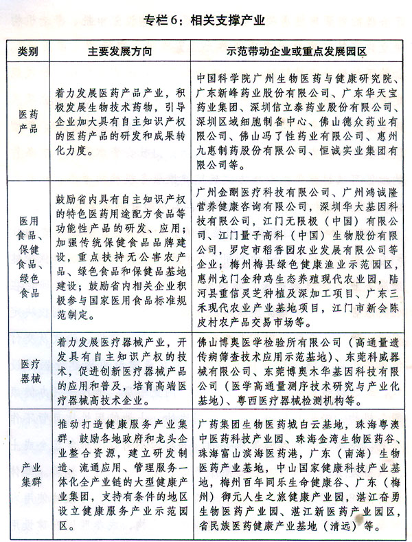 (六)培育發(fā)展健康服務(wù)業(yè)相關(guān)支撐產(chǎn)業(yè)。 18.重點(diǎn)推進(jìn)醫(yī)藥產(chǎn)業(yè)研發(fā)和應(yīng)用。著力發(fā)展醫(yī)藥和醫(yī)療器械產(chǎn)業(yè),引導(dǎo)企業(yè)加大具有自主知識(shí)產(chǎn)權(quán)的新藥和醫(yī)療器械新產(chǎn)品的研發(fā)和成果轉(zhuǎn)化力度,提升企業(yè)創(chuàng)新能力和核心競(jìng)爭(zhēng)力。以現(xiàn)代化中藥、生物醫(yī)藥、特色化學(xué)原料藥、藥物制劑、體外診斷試劑、高端醫(yī)療器械、康復(fù)輔助器具和新型智能康復(fù)系統(tǒng)與設(shè)備及關(guān)鍵制藥裝備、健康穿戴裝備等為重點(diǎn),開發(fā)具有自主知識(shí)產(chǎn)權(quán)的產(chǎn)品和技術(shù)。強(qiáng)化先進(jìn)醫(yī)療技術(shù)發(fā)明應(yīng)用推廣,加快實(shí)施廣東創(chuàng)新醫(yī)療器械產(chǎn)品應(yīng)用示范工程,促進(jìn)創(chuàng)新醫(yī)療器械產(chǎn)品的應(yīng)用和普及,培育一批擁有自主知識(shí)產(chǎn)權(quán)和核心競(jìng)爭(zhēng)力的高端醫(yī)療器械高新技術(shù)企業(yè)。(省科技廳、食品藥品監(jiān)管局、經(jīng)濟(jì)和信息化委負(fù)責(zé),省衛(wèi)生計(jì)生委、發(fā)展改革委參與)