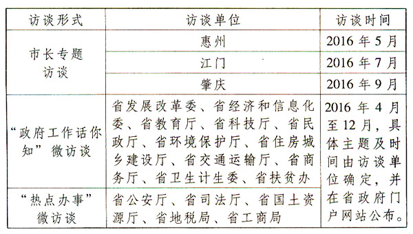 1.“政府工作話你知”微訪談。圍繞2016年省政府重點工作,請與宏觀經濟和民生關系密切的省發展改革委、省經濟和信息化委、省教育廳、省科技廳、省民政廳、省環境保護廳、省住房城鄉建設廳、省交通運輸廳、省商務廳、省衛生計生委、省扶貧辦負責同志上線省政府門戶網站官方微博開展“政府工作話你知”微訪談,通過微博問答方式,宣傳工作舉措和成果、解讀政策文件。