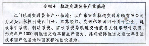 (四)軌道交通裝備。 以江門市為主,依托珠三角城際軌道交通網絡建設,重點發展軌道交通裝備及其關鍵系統零部件,建立健全研發設計、生產制造和產品標準、知識產權保護體系,提升裝備自主化能力。加快延伸產業鏈,大力提高整車配套和生產能力。研究開發磁懸浮、真空管道等超高速軌道交通技術及相關裝備。到2017年,形成1000輛軌道交通車輛年生產能力。到2020年,建成世界一流的高端軌道交通裝備修造產業基地。