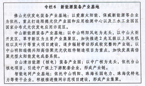 重點發展光伏裝備、風電裝備和核電裝備,延伸發展產業鏈,加快發展新型傳感測量、通訊信息、電能質量控制、決策支持、超導、分布式電源柔性接入技術等智能電網先進技術,培育開發高溫氣冷堆、10兆瓦及以上風電和光伏發電技術及裝備。以佛山市、中山市為主,重點發展高倍聚光型太陽能發電成套系統;以中山市為主,重點發展大型風電機組整機及部件,提升研發水平,加強海上風電機組及風光互補系統研制及產業化;以江門市為主,重點發展核電輔助裝備和非動力核技術。到2017年,培育形成1-2家系統設計、設備制造一體化的輸配電工程總承包公司。到2020年,打造成為國內重要的新能源裝備制造基地之一。