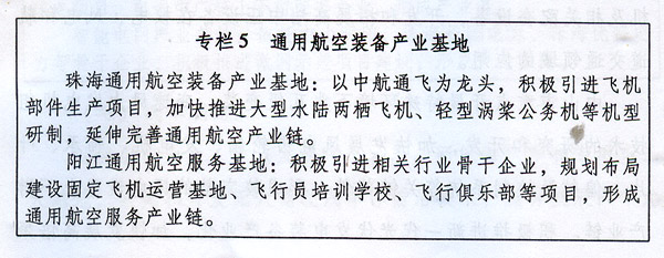 以珠海市為主,以低空領域開放為契機,重點發展航空關鍵技術研發,以及通用飛機、水上飛機、無人機、特種飛行器和輕型直升機等,積極發展機場空管導航監視裝備和牽引車、氣源車、電源車和空調車等機場地勤設備。研究開發地效飛行器、通用航空發動機等高端航空裝備。到2017年,培育壯大1家通航裝備制造企業。到2020年,成為國內主要通用航空產業基地之一。