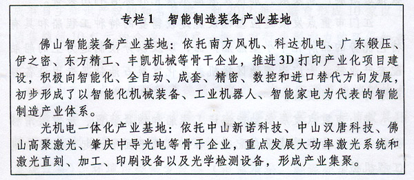 (一)智能制造裝備。 以佛山市、順德區為主,重點發展關鍵智能制造基礎共性技術,推進以傳感器、自動控制系統、工業機器人、伺服和執行部件為代表的智能裝置的研發和產業化,大幅提高制造過程信息化水平,培育開發智能化生產線和數字化車間(工廠),以及高精密數控機床及系統、工作母機等重大設備,提升重大智能成套裝備的集成水平,形成高度靈活、個性化、網絡化的產業鏈。支持智能制造裝備企業在工程承包、維修改造、設備租賃等方面開展增值服務,促進企業由加工制造型向生產服務型轉變。到2017年,初步建成在全國具有較大影響力的智能制造裝備產業基地。到2020年,產值規模達2000億元,形成2家以上行業領軍企業。