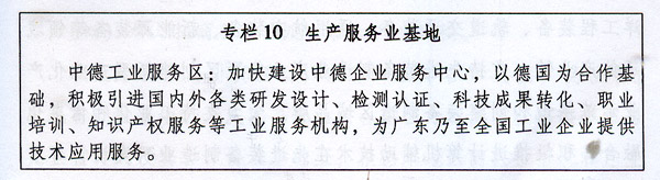 (十)生產服務業。 建設中德生產服務業集聚區等一批中外先進裝備制造合作示范基地,建立一批檢驗檢測、教育培訓、法律服務等公共服務平臺,建設一批功能突出、輻射功能強的生產服務業集聚區,推動產業金融、工業設計、信息系統服務、現代物流配送、電子商務、會展等與先進制造業緊密相連的生產服務業向先進裝備制造基地集聚。順應全球先進制造業發展新趨勢,以佛山市、珠海市、順德區為主,積極發展先進制造領域的全新商業模式和合作模式,推動服務型先進制造業發展,形成高度靈活、個性化、數字化的產品與服務的生產模式。支持企業提升系統集成能力,發展產品設計、技術研發、工程總包和系統控制等業務,建立現代銷售體系。加快生產制造與信息技術服務融合,發展研發設計、第三方物流、融資租賃、科技信息服務、檢驗檢測認證、電子商務、服務外包、展覽等新業態。以信息化為紐帶,輻射推進珠江西岸各市建設為本地裝備制造產業服務的科研、銷售、商務會展等行業公共服務平臺。