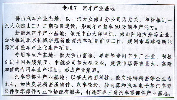(七)汽車制造。 以佛山市為主,重點發展汽車整車、新能源汽車和專用車三大基地,研究和開發無人駕駛汽車等前沿技術,延伸發展汽車尤其是新能源汽車關鍵零部件生產,形成與整車生產能力相匹配的系統配套能力。到2017年,汽車整車年生產能力超過60萬輛,其中新能源汽車年綜合生產能力超過5萬輛。到2020年,新能源汽車年綜合生產能力20萬輛,成為全國重要的新能源汽車生產基地之一。