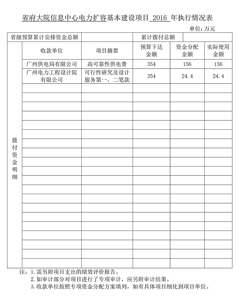 省府大院信息中心電力擴容項目由我廳于2015年1月向省發展改革委申請立項(粵辦函〔2015〕1號),今年1月省發展改革委粵發改投資函〔2016〕138號文批復我廳同意項目立項,今年3月你廳粵財建〔2016〕27號文批復該項目2016年度預算資金1000萬元。