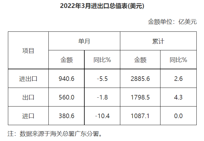 廣東省外貿(mào)進出口總值表(2022年3月)