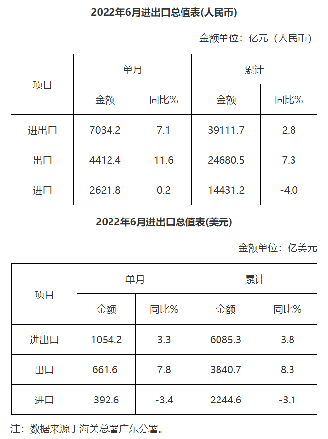 廣東省外貿(mào)進出口總值表(2022年6月)