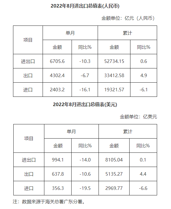 廣東省外貿(mào)進(jìn)出口總值表(2022年8月)