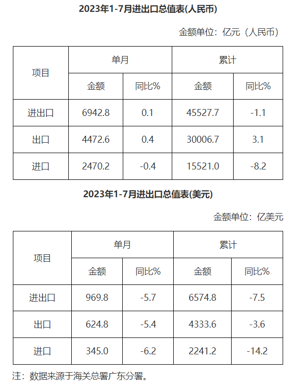 廣東省外貿進出口總值表(2023年1-7月)