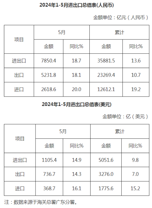 廣東省外貿(mào)進(jìn)出口總值表(2024年1-5月)
