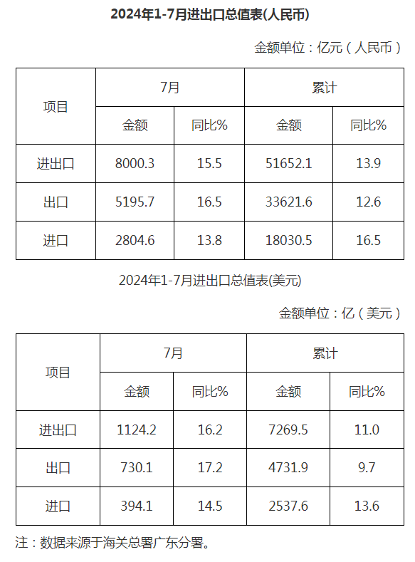廣東省外貿(mào)進(jìn)出口總值表(2024年1-7月)