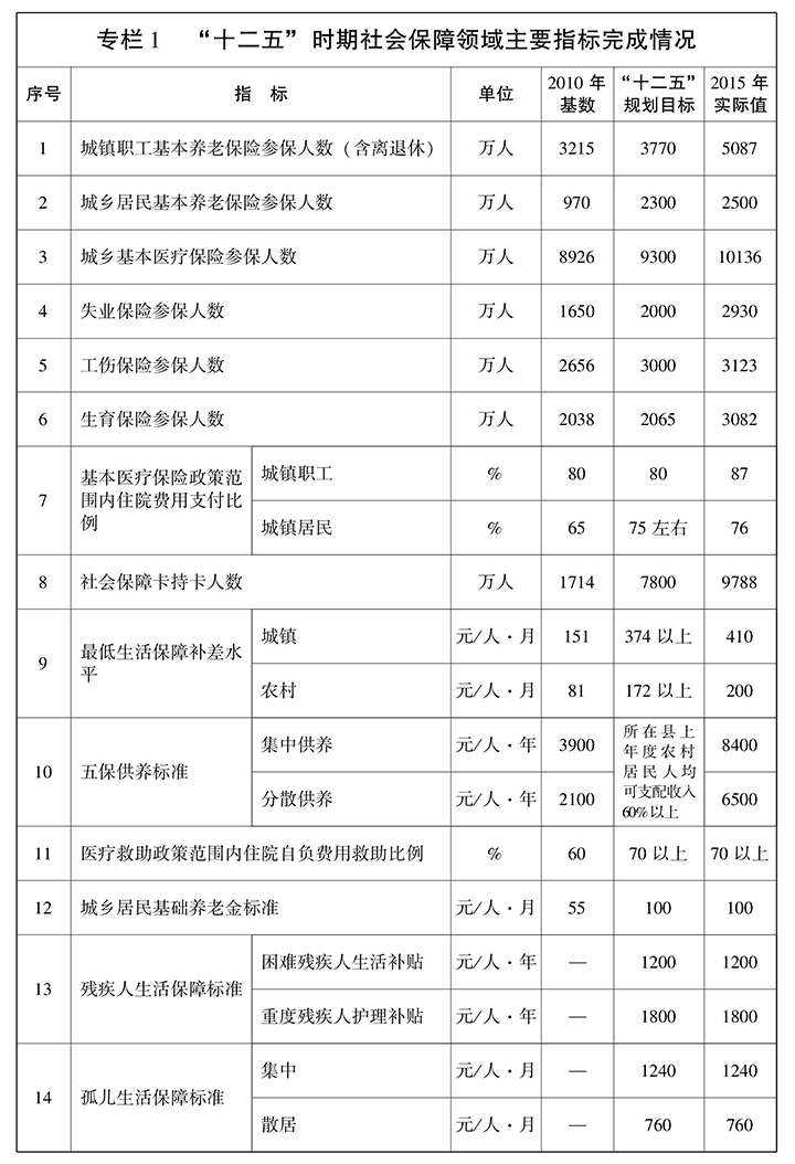 第一章 貫徹新發(fā)展理念 開創(chuàng)社會保障新局面 ………………………………………………………2 第一節(jié) 發(fā)展基礎(chǔ)…………………………………………………………………………………………2 第二節(jié) 指導(dǎo)思想…………………………………………………………………………………………6 第三節(jié) 基本原則…………………………………………………………………………………………7 第四節(jié) 發(fā)展目標(biāo)…………………………………………………………………………………………8 第二章 堅(jiān)持城鄉(xiāng)統(tǒng)籌 加快推進(jìn)社會保險(xiǎn)城鄉(xiāng)一體化 ………………………………………………10 第一節(jié) 實(shí)現(xiàn)社會保險(xiǎn)法定人員全覆蓋…………………………………………………………………11 第二節(jié) 完善養(yǎng)老保險(xiǎn)省級統(tǒng)籌…………………………………………………………………………11 第三節(jié) 推進(jìn)養(yǎng)老保險(xiǎn)城鄉(xiāng)一體化………………………………………………………………………12 第四節(jié) 推進(jìn)醫(yī)療保險(xiǎn)城鄉(xiāng)一體化………………………………………………………………………13 第五節(jié) 完善工傷失業(yè)保險(xiǎn)制度…………………………………………………………………………14 第六節(jié) 確保社保基金安全可持續(xù)運(yùn)行…………………………………………………………………15 第七節(jié) 發(fā)展補(bǔ)充保險(xiǎn)……………………………………………………………………………………16 第三章 堅(jiān)守民生底線 保障困難群眾基本生活權(quán)益 …………………………………………………17 第一節(jié) 健全社會救助體系………………………………………………………………………………17 第二節(jié) 發(fā)展福利慈善事業(yè)………………………………………………………………………………19 第三節(jié) 完善優(yōu)撫保障體系………………………………………………………………………………21 第四節(jié) 助力貧困人口脫貧………………………………………………………………………………21 第四章 保障殘疾人權(quán)益 步實(shí)現(xiàn)小康 …………………………………………………………………22 第一節(jié) 強(qiáng)化殘疾人基本生活保障………………………………………………………………………23 第二節(jié) 加強(qiáng)殘疾人教育救助……………………………………………………………………………24 第三節(jié) 促進(jìn)殘疾人穩(wěn)定就業(yè)……………………………………………………………………………25 第五章 穩(wěn)步提升待遇水平 增強(qiáng)人民群眾獲得感 ……………………………………………………26 第一節(jié) 提高底線民生保障水平…………………………………………………………………………26 第二節(jié) 提高社會保險(xiǎn)待遇水平…………………………………………………………………………26 第六章 健全管理服務(wù)體系 提升公共服務(wù)水平 ………………………………………………………27 第一節(jié) 健全社會保險(xiǎn)經(jīng)辦服務(wù)體系……………………………………………………………………27 第二節(jié) 強(qiáng)化社會救助服務(wù)管理能力……………………………………………………………………28 第三節(jié) 構(gòu)建社會福利綜合服務(wù)體系……………………………………………………………………29 第四節(jié) 提升殘疾人公共服務(wù)水平………………………………………………………………………29 第五節(jié) 建立社會力量和市場參與機(jī)制…………………………………………………………………31 第七章 完善保障機(jī)制 強(qiáng)化組織落實(shí) …………………………………………………………………32 第一節(jié) 加強(qiáng)統(tǒng)籌推進(jìn)……………………………………………………………………………………32 第二節(jié) 加強(qiáng)財(cái)政保障……………………………………………………………………………………32 第三節(jié) 加強(qiáng)信息化建設(shè)…………………………………………………………………………………33 第四節(jié) 加強(qiáng)宣傳引導(dǎo)……………………………………………………………………………………34 第五節(jié) 加強(qiáng)監(jiān)督考評……………………………………………………………………………………34