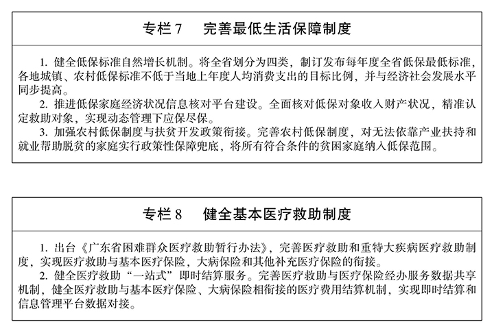 完善最低生活保障制度。修訂《廣東省城鄉(xiāng)居(村)民最低生活保障制度實(shí)施辦法》,推進(jìn)城鄉(xiāng)低保統(tǒng)籌發(fā)展。健全物質(zhì)救助與服務(wù)救助相結(jié)合的最低生活保障制度,完善低保對象認(rèn)定辦法,建立健全信息核對機(jī)制,優(yōu)化審核審批程序,強(qiáng)化動態(tài)管理,實(shí)現(xiàn)應(yīng)保盡保。加強(qiáng)低保與就業(yè)救助、扶貧開發(fā)等政策銜接,鼓勵有勞動條件的低保對象依靠自身努力回歸社會。