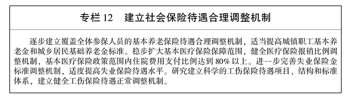 建立健全與經(jīng)濟(jì)社會發(fā)展水平相適應(yīng)的社會保險(xiǎn)待遇確定和調(diào)整機(jī)制,穩(wěn)步提高社會保障待遇水平,推進(jìn)城鄉(xiāng)、區(qū)域、行業(yè)和人群間的標(biāo)準(zhǔn)銜接平衡。按照穩(wěn)定可持續(xù)原則,合理確定住院、門診特定病種、普通門診統(tǒng)籌、大病保險(xiǎn)等各項(xiàng)待遇。調(diào)整職工醫(yī)保個人賬戶政策。逐步提高各級財(cái)政對城鄉(xiāng)居民參加醫(yī)療保險(xiǎn)的補(bǔ)助標(biāo)準(zhǔn)。規(guī)范完善生育保險(xiǎn)待遇保障范圍和標(biāo)準(zhǔn),實(shí)現(xiàn)產(chǎn)前、產(chǎn)中、產(chǎn)后全程保障。建立健全職業(yè)康復(fù)、勞動能力鑒定和傷殘輔助器具配置標(biāo)準(zhǔn)體系。